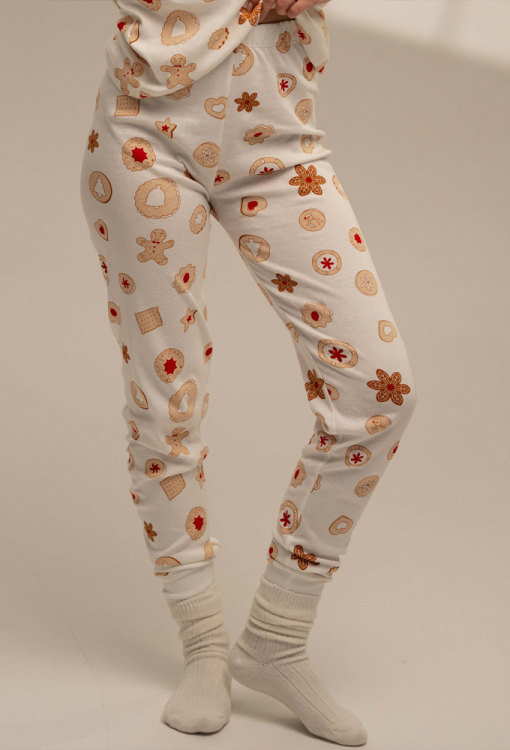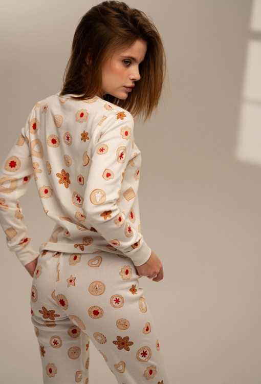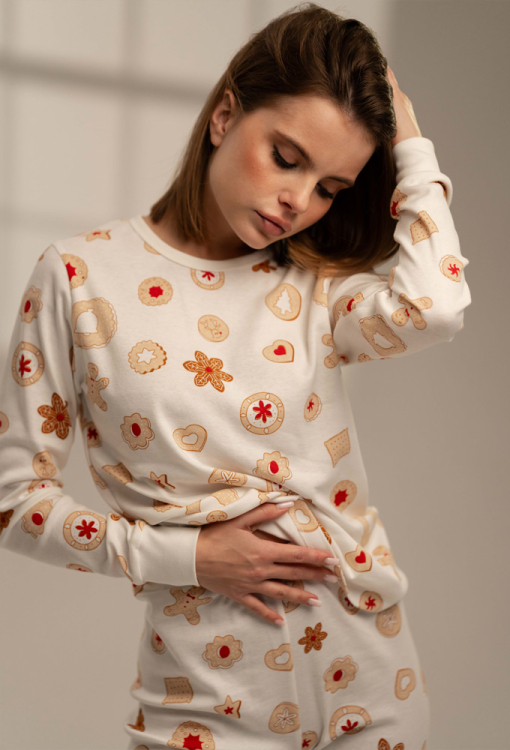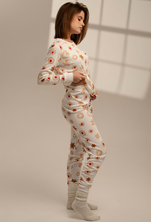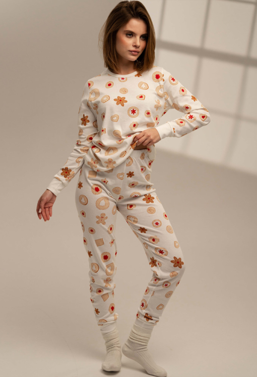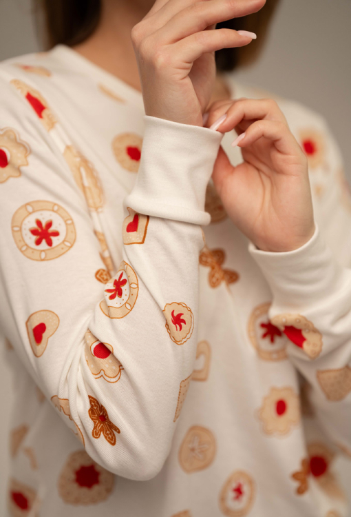 Уютная женская новогодняя пижама от украинского бренда German Volf создаст особенное магическое настроение. Пижама выполнена из качественного и мягкого хлопка, бежевого цвета с принтом в виде рождественского имбирного печенья, состоит из кофты и штанов. Кофта прямого силуэта с длинными рукавами и круглым вырезом, рукава и горловина модели обработаны однотонными манжетами. Штаны с мягкой резинкой в поясе и манжетами внизу, создают удобную посадку и обеспечивают свободу движений. Пижама очень красивая и комфортная, подойдет как для сна, так и для домашнего отдыха, а также может быть отличным подарком близкому или любимому человеку на новогодние праздники!