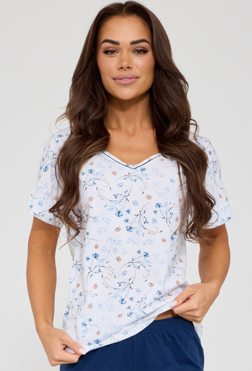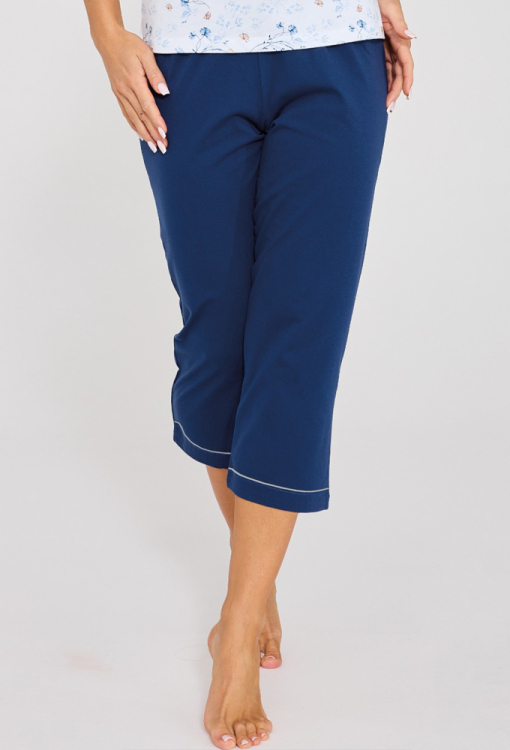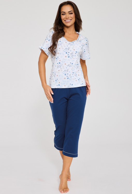 Удобная женская пижама Gianna от польского бренда Cornette. Пижама выполнена из качественного и мягкого хлопка, состоит из футболки белого цвета с принтом из голубых цветочков и капри синего цвета. Футболка прямого силуэта, с короткими рукавами и V-образным вырезом горла, украшенным тонким кантом синего цвета. Капри с мягкой резинкой в поясе и удобной посадкой, внизу обработаны тонким кантом белого цвета. Пижама стильная и очень комфортная, идеальна для любого сезона, упакованная в фирменную коробочку, также может быть замечательным подарком любимому и близкому человеку.