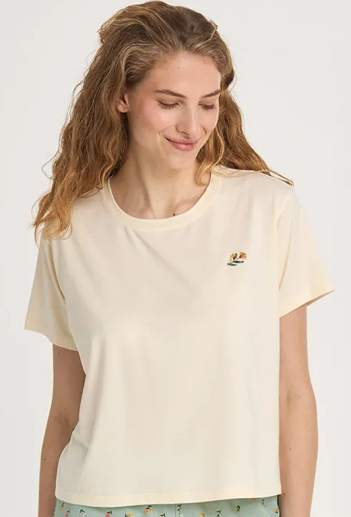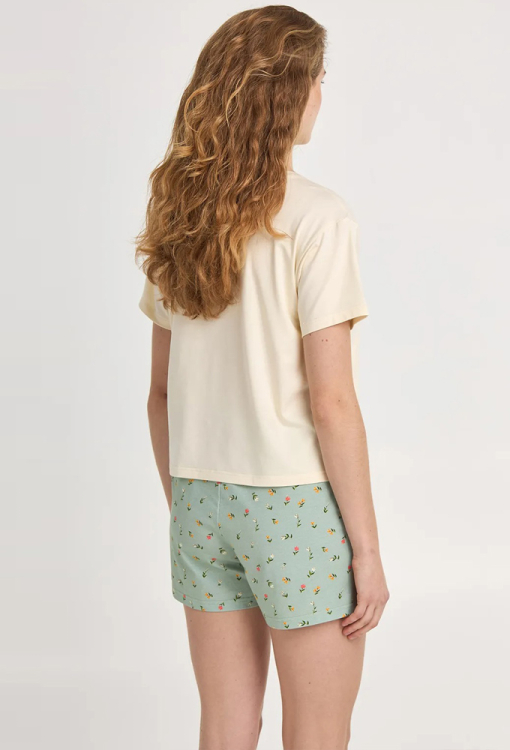 Удобная женская пижама из коллекции Green Meadow от украинского бренда Ellen. Пижама выполнена из качественного и мягкого хлопка, состоит из футболки кремового цвета и коротких шорт зеленого цвета в цветочный принт розового и оранжевого цвета. Футболка прямого силуэта, с короткими рукавами и круглым вырезом горла, вверху слева украшена нежным принтом букетика с цветами. Шорты также прямого кроя и с мягкой резинкой в поясе. Пижама очень красивая и комфортная, также может быть отличной одеждой для дома или полезным подарком любимому и близкому человеку.