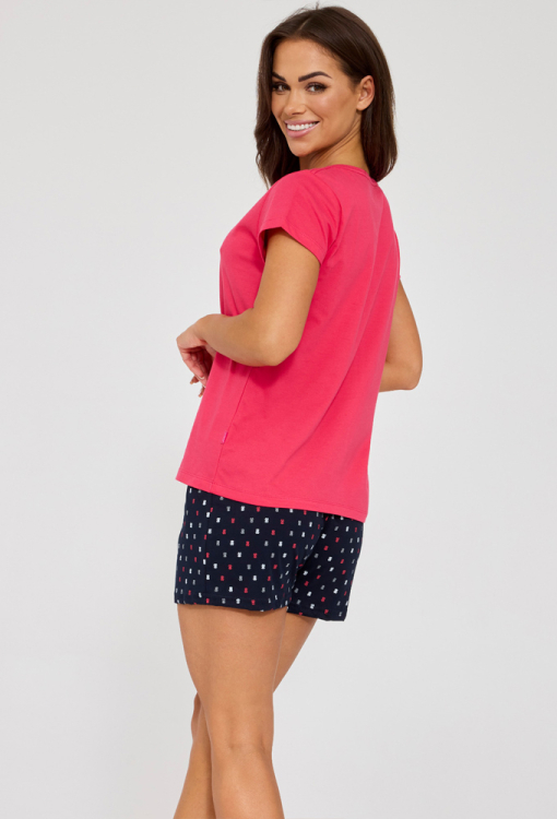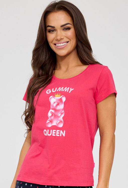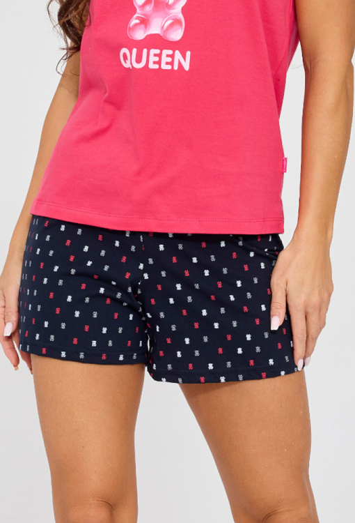 Яркая женская пижама Gummy Queen от польского бренда Cornette. Пижама выполнена из качественного и мягкого хлопка, состоит из футболки розового цвета и темно-синих шорт с мелким принтом из разноцветных желейных конфет в виде мишек. Футболка прямого силуэта, с короткими рукавами и круглым вырезом горла, спереди украшена принтом красной желейной конфеты в короне и надписью "Gummy Queen". Шорты прямые с удобной посадкой и мягкой резинкой в поясе. Пижама очень красивая и комфортная, идеальна для теплых вечеров и ленивых утренних часов, также может быть замечательным подарком любимому и близкому человеку.
