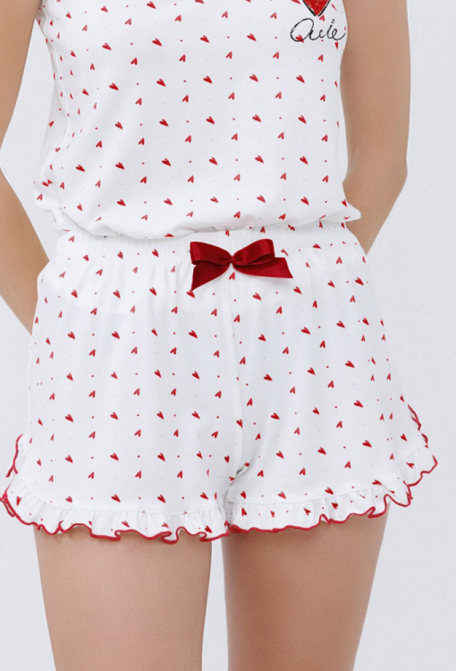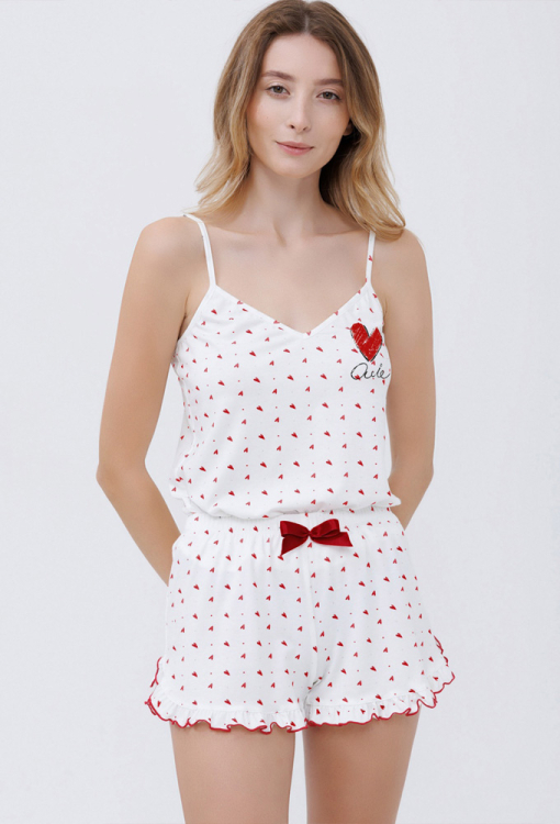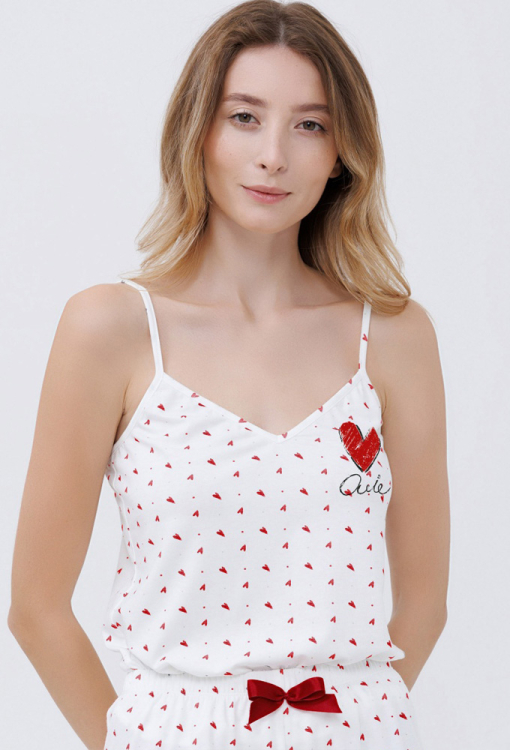 Легкая женская пижама из коллекции Heart от украинского бренда Roksana. Пижама выполнена из мягкого и качественного хлопка белого цвета с принтом в виде маленьких сердечек красного цвета, состоит из майки прямого силуэта и коротких шорт. Майка с тонкими регулируемыми бретелями и V-образным декольте, вверху слева украшена принтом красного сердца. Шорты свободного кроя и с мягкой резинкой в поясе, внизу обработаны рюшами с красной отделкой и украшены бантиком на талии. Пижама очень красивая и приятная к телу, идеальна для сна и уютного домашнего отдыха, а также может быть полезным подарком любимому и близкому человеку.