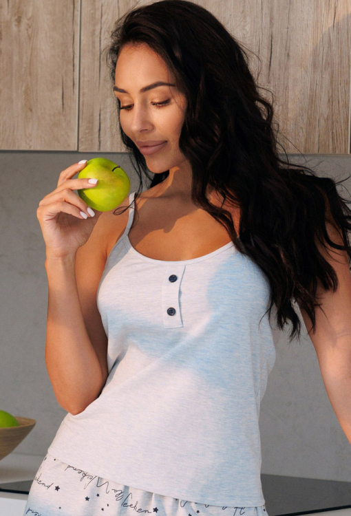 Легкая женская пижама из коллекции Hello Weekend от украинского бренда Roksana. Пижама выполнена из мягкого и качественного хлопка голубого цвета, состоит из однотонной майки и коротких шорт в принт из надписей и звезд в синем оттенке. Майка прямого силуэта, с тонкими регулируемыми бретелями и круглым вырезом горла, вверху украшена планкой с пуговицами. Шорты прямого кроя и с мягкой резинкой в поясе, создают удобную посадку и непринужденный силуэт. Пижама очень красивая и приятная к телу, идеальна для сна в любое время года, а также может быть полезным подарком любимому и близкому человеку.