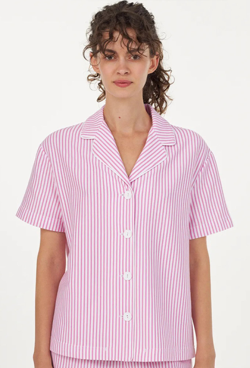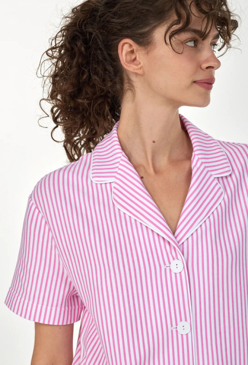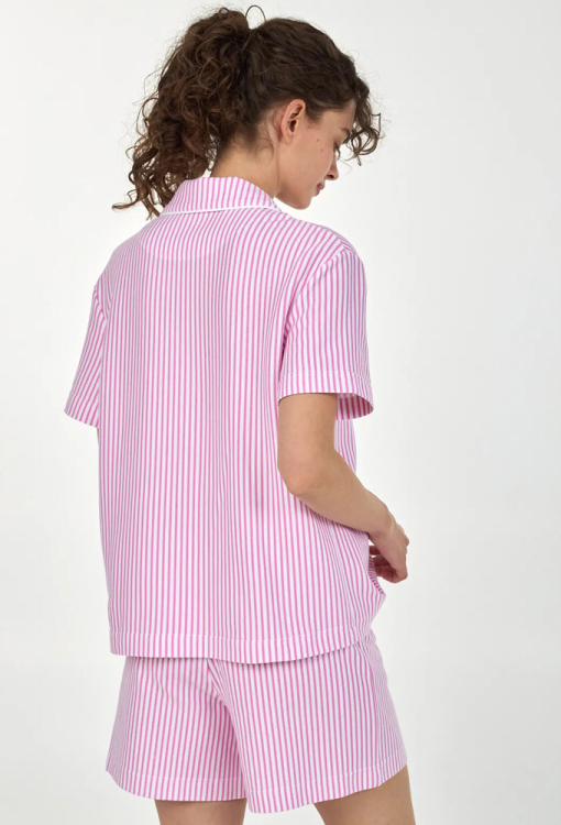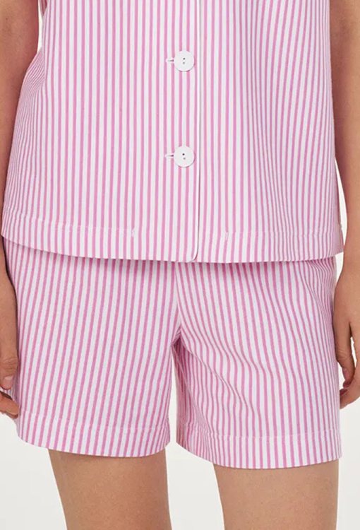 Классическая женская пижама из коллекции Ice Cream Time от украинского бренда Ellen. Пижама выполнена из качественного и мягкого хлопка, розового цвета с белым полосатым принтом, состоит из рубашки и шорт прямого силуэта. Рубашка с короткими рукавами и отложным воротником, застегивается на пуговицы, воротник модели украшен тонким белым кантом. Шорты с удобной посадкой и мягкой резинкой в поясе. Пижама очень красивая и комфортная, идеальный выбор для особого настроения или подарка любимому и близкому человеку.
