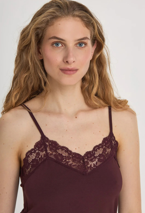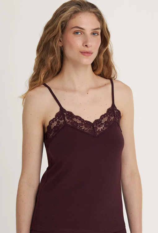 Нежная женская пижама из коллекции Laura от украинского бренда Ellen. Пижама выполнена из качественного и мягкого хлопка бордового цвета, состоит из майки полуприлегающего силуэта и коротких шорт. Майка с тонкими регулируемыми бретелями и V-образным декольте, по линии выреза украшена вставками из ажурного кружева. Шорты прямого кроя и с мягкой резинкой в поясе, внизу обработаны кружевом. Пижама очень красивая и комфортная, идеальна для сна и утренних ритуалов, а также может быть полезным подарком любимому и близкому человеку.