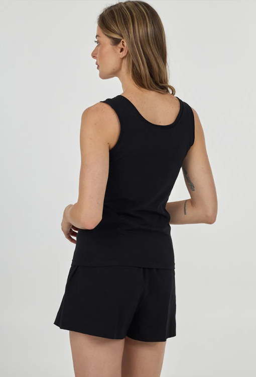 Удобная женская пижама из коллекции Linen Black от украинского бренда Ellen. Пижама выполнена из качественного и мягкого хлопка черного цвета, состоит из майки полуприлегающего силуэта и шорт прямого кроя. Майка на широких бретелях и с круглым вырезом горла, вдоль передней полки обработана декоративным швом. Шорты с удобной посадкой и мягкой резинкой в поясе, спереди оформлены фиксированными стрелками. Пижама очень красивая и комфортная, может быть отличной одеждой для дома или полезным подарком любимому и близкому человеку.