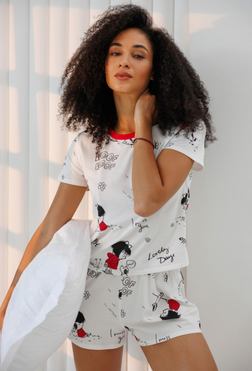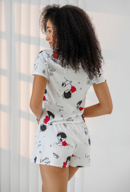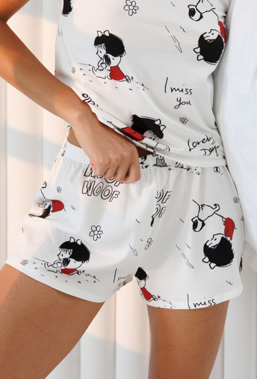 Яркая женская пижама из коллекции Love от украинского бренда Roksana. Пижама выполнена из мягкого и качественного хлопка белого цвета с оригинальным принтом в виде девочки с собачкой и надписей "Love", состоит из Футболки и шорт прямого силуэта. Футболка с короткими рукавами и круглым вырезом горла, горловина украшена кантом красного цвета. Шорты с удобной посадкой и мягкой резинкой в поясе. Пижама очень красивая и приятная к телу, идеальна для сна, утренних сборов и вечернего релакса дома, также может быть замечательным подарком любимому и близкому человеку.