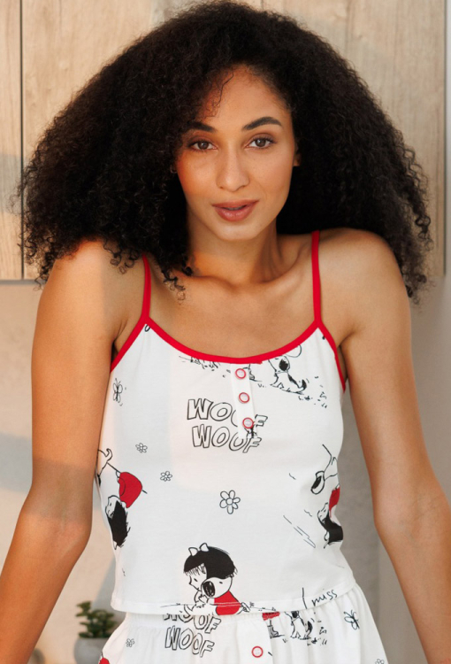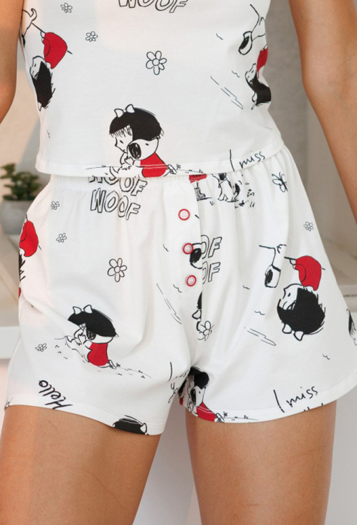 Летняя женская пижама из коллекции Love от украинского бренда Roksana. Пижама выполнена из мягкого и качественного хлопка белого цвета с оригинальным принтом в виде девочки с собачкой и надписей "Love", состоит из майки и шорт прямого силуэта. Майка с тонкими регулируемыми бретелями и круглым декольте, линия выреза украшена кантом красного цвета, бретели выполнены в тон отделки. Шорты с удобной посадкой и мягкой резинкой в поясе. Пижама очень красивая и приятная к телу, идеальна для сна, утренних сборов и вечернего релакса дома, также может быть замечательным подарком любимому и близкому человеку.