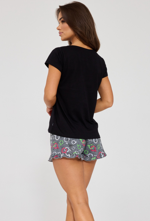 Романтичная женская пижама Love Symbol от польского бренда Cornette. Пижама выполнена из качественного и мягкого хлопка, состоит из футболки черного цвета и серых шорт с принтом в виде разноцветных символов любви. Футболка свободного силуэта, с короткими рукавами и круглым вырезом горла, вверху слева украшена принтом женского и мужского начала. Шорты прямые с мягкой резинкой в поясе и очаровательными рюшами внизу, на талии украшены розовым атласным бантиком. Пижама очень красивая и комфортная, идеальна для сна и домашнего уюта, также может быть замечательным подарком любимому и близкому человеку.