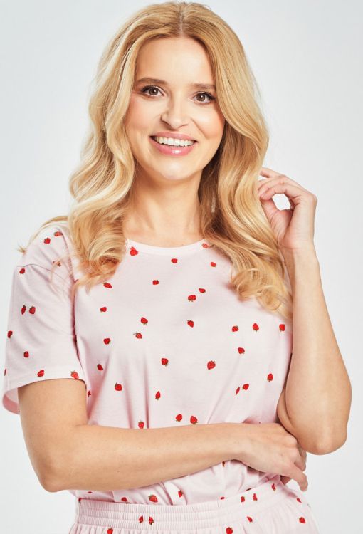Очаровательная женская пижама Viola от польского бренда Taro. Пижама выполнена из качественного и мягкого хлопка нежно-розового цвета с принтом в виде красных клубничек, состоит из футболки и шорт свободного силуэта. Футболка с короткими рукавами и круглым вырезом горла, шорты с удобной посадкой и мягкой резинкой в поясе, спереди украшены тремя пуговицами. Пижама очень красивая, легкая и удобная, идеальна для летних теплых ночей и домашнего отдыха, а также может быть замечательным подарком любимому или близкому человеку.