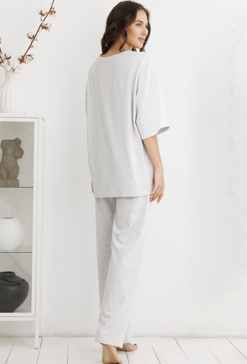 Комфортная женская пижама из коллекции Melange от украинского бренда Roksana. Пижама выполнена из мягкого и качественного хлопка серого цвета, состоит из футболки свободного силуэта и штанов прямого кроя. Футболка удлиненная, с рукавами 3/4, заниженным плечевым швом и круглым вырезом горла. Штаны с мягкой резинкой в поясе и удобными боковыми карманами, регулируются по ширине с помощью внутреннего шнурка. Пижама очень красивая и приятная к телу, идеальна для сна, домашних дел или уютных выходных, а также может быть полезным подарком любимому и близкому человеку.