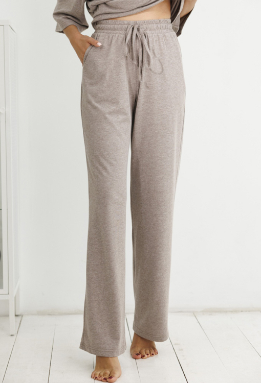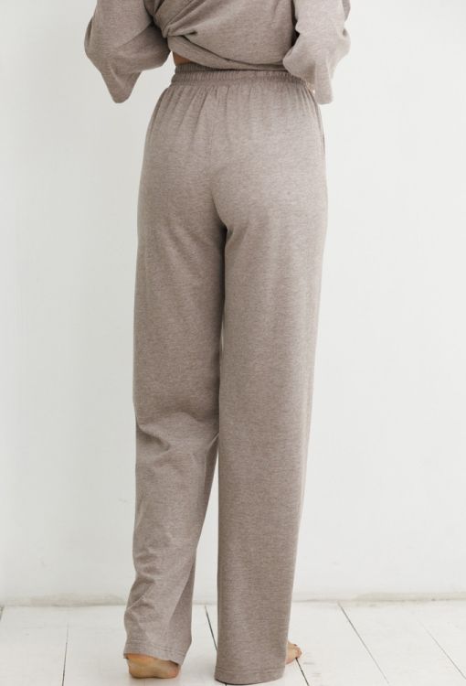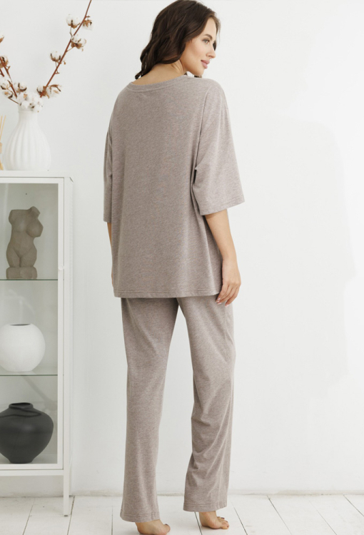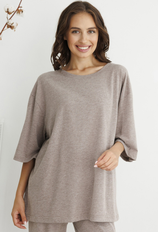 Комфортная женская пижама из коллекции Melange от украинского бренда Roksana. Пижама выполнена из мягкого и качественного хлопка коричневого цвета, состоит из футболки свободного силуэта и штанов прямого кроя. Футболка удлиненная, с рукавами 3/4, заниженным плечевым швом и круглым вырезом горла. Штаны с мягкой резинкой в поясе и удобными боковыми карманами, регулируются по ширине с помощью внутреннего шнурка. Пижама очень красивая и приятная к телу, идеальна для сна, домашних дел или уютных выходных, а также может быть полезным подарком любимому и близкому человеку.