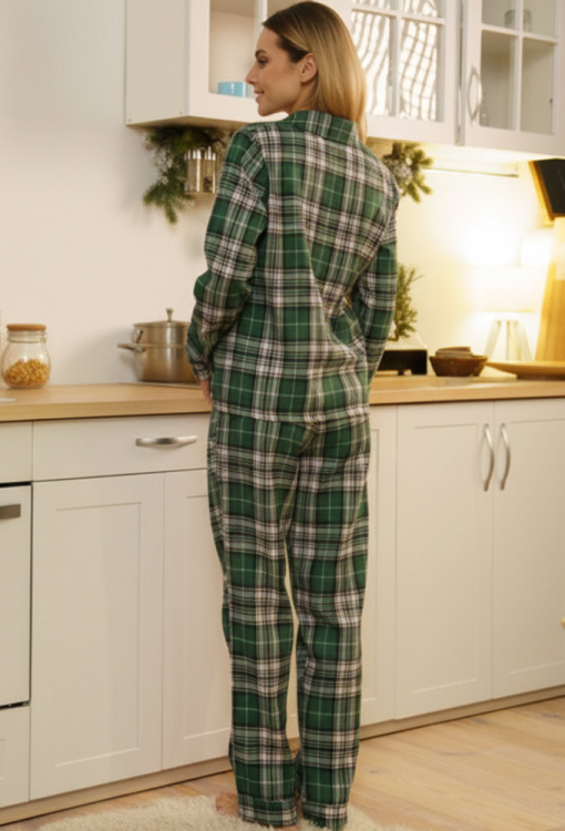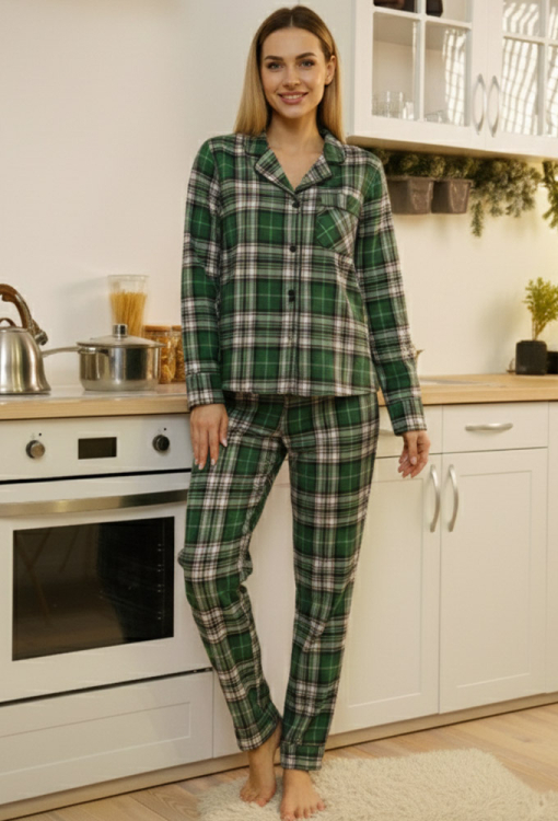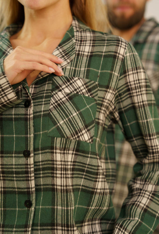 Классическая женская пижама от украинского бренда Mi-Mi. Пижама выполнена из качественного и мягкого хлопка, зеленого цвета в кремовый клетчатый принт с черным акцентом, состоит из рубашки со штанами прямого силуэта. Рубашка с длинными рукавами и отложным воротником, застегивается на пуговицы. На груди слева модель украшена маленьким накладным карманчиком, рукава обработаны свободными манжетами. Штаны с удобной посадкой и мягкой резинкой в поясе, внизу на свободных манжетах. Пижама стильная и очень комфортная, позволит создать особое настроение в праздничные дни, а также может быть прекрасным подарком любимому и близкому человеку!
