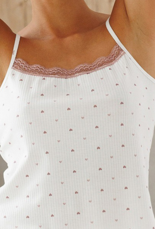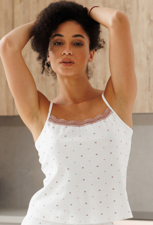 Сексуальная женская пижама из коллекции Мур Квитка от украинского бренда Roksana. Пижама выполнена из мягкого и качественного хлопка, белого цвета с мелким принтом в виде сердечек темно-розового цвета, состоит из майки и коротких шорт. Майка полуприлегающего силуэта, на тонких регулируемых бретелях и с прямоугольным декольте, по линии выреза украшена вставкой из ажурного кружева темно-розового цвета. Шорты облегающего кроя, с удобной посадкой и мягкой резинкой в поясе. Пижама очень красивая и приятная к телу, идеальна для сна в любое время года, а также может быть полезным подарком любимому и близкому человеку.