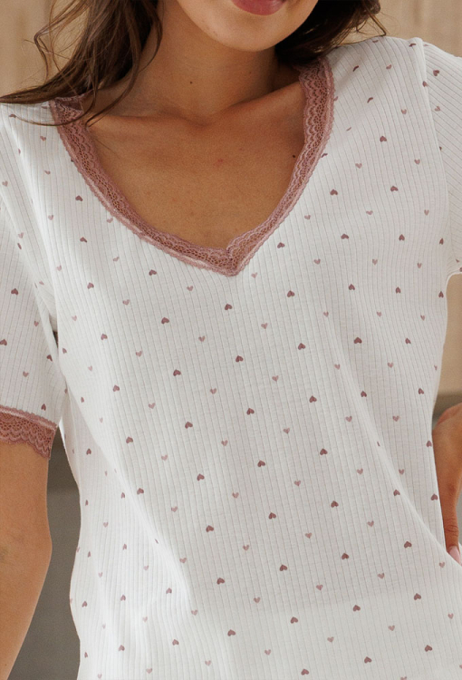 Комфортная женская пижама из коллекции Мур Квитка от украинского бренда Roksana. Пижама выполнена из мягкого и качественного хлопка, белого цвета с мелким принтом в виде сердечек темно-розового цвета, состоит из футболки и шорт. Футболка свободного силуэта, с короткими рукавами и V-образным вырезом горла, рукава и горловина украшены вставками из ажурного кружева темно-розового цвета. Шорты также свободного кроя, с удобной посадкой и мягкой резинкой в поясе. Пижама очень красивая и приятная к телу, идеальна для сна в любое время года, а также может быть полезным подарком любимому и близкому человеку.