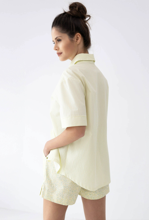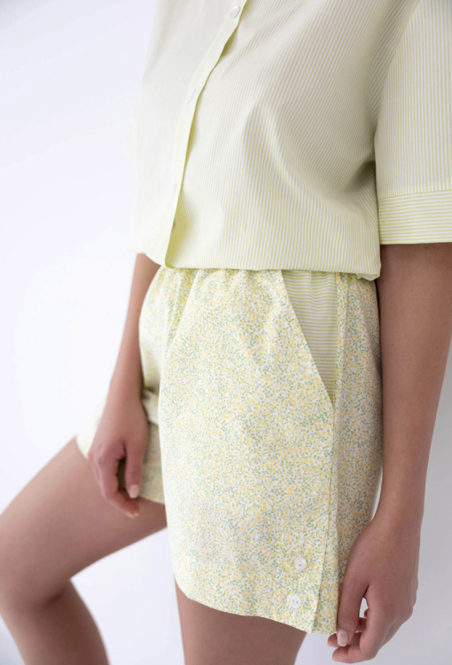 Удобная женская пижама Ophelia от польского бренда Sensis. Пижама выполнена из качественного и мягкого хлопка, состоит из рубашки салатового цвета с белым полосатым принтом и салатовых шорт с мелким цветочным принтом. Рубашка свободного силуэта, с короткими рукавами, приспущенной плечевой линией и отложным воротником, застегивается на пуговицы. Шорты также свободные с мягкой резинкой в поясе и удобными боковыми карманами, по бокам внизу обработаны разрезами с застежкой на пуговицах. Пижама красивая и невероятно комфортная, идеальный вариант для сна и стильного домашнего образа, а также может быть полезным подарком любимому или близкому человеку.