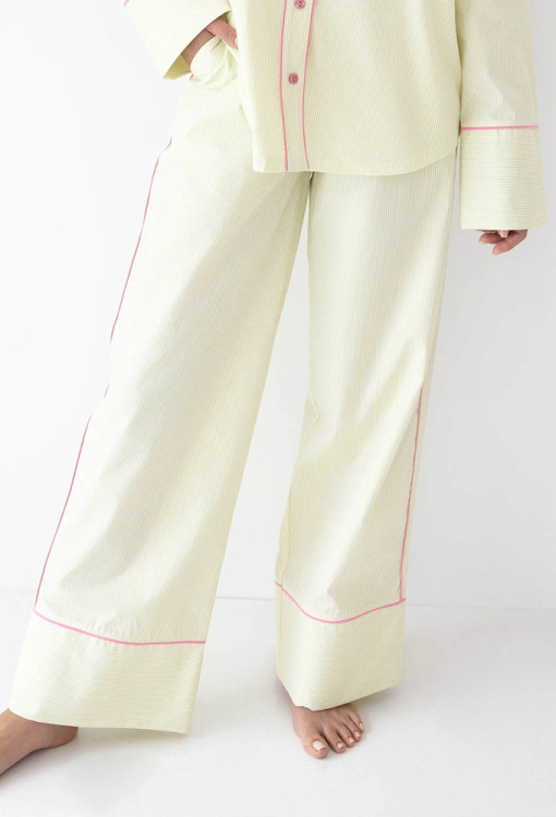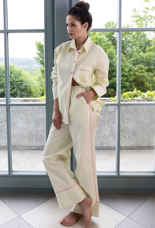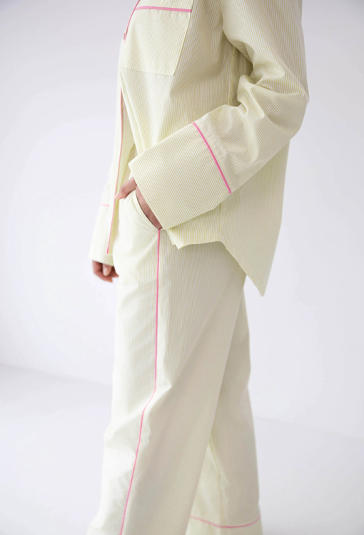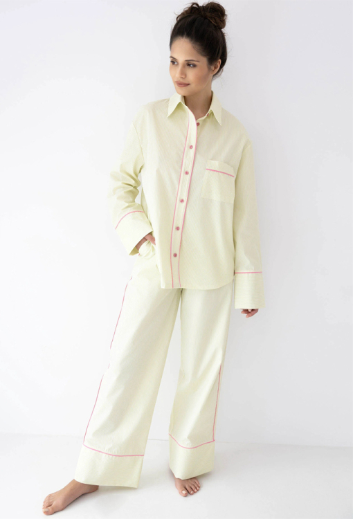 Стильная женская пижама Raven от польского бренда Sensis. Пижама выполнена из качественного и мягкого хлопка, салатового цвета в тонкую белую полоску, состоит из рубашки и штанов свободного силуэта. Рубашка с длинными рукавами, приспущенной плечевой линией, отложным воротником и нагрудным карманом, застегивается на пуговицы. Планка застежка, карман и рукава модели украшены тонким кантом розового цвета. Штаны с мягкой резинкой в поясе и удобными боковыми карманами, по бокам и внизу обработаны ярким контрастным кантом. Пижама красивая и невероятно комфортная, идеальный вариант для сна и стильного домашнего образа, а также может быть полезным подарком любимому или близкому человеку.