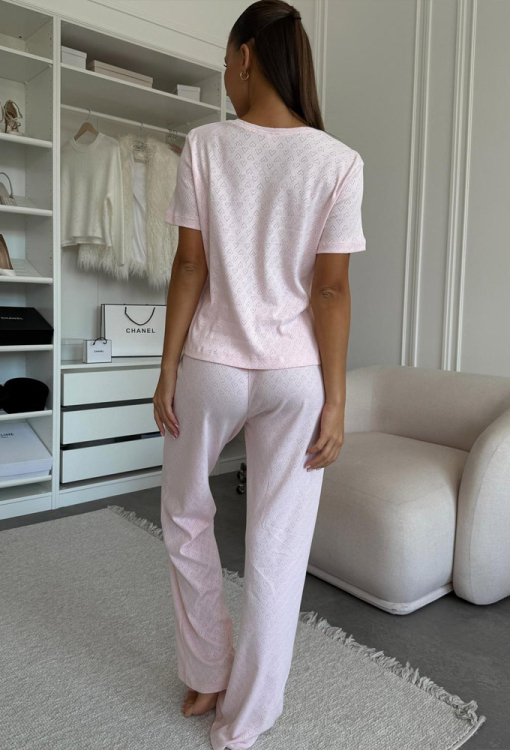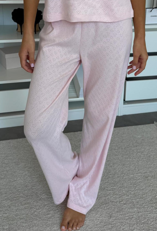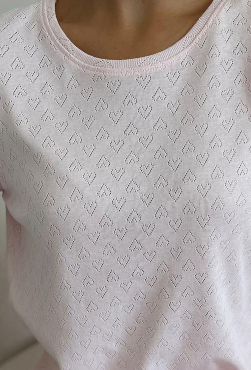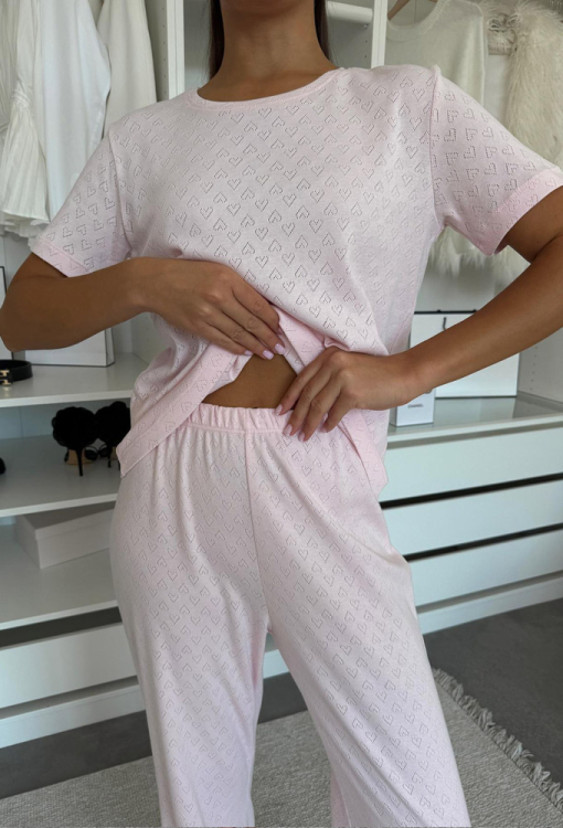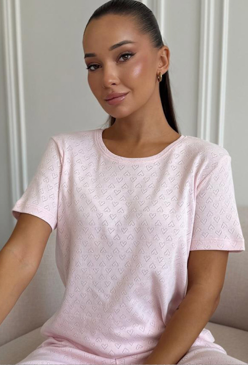 Нежная женская пижама Rose Amour от украинского бренда Cosy. Пижама выполнена из качественного и мягкого хлопка розового цвета с ажурной фактурой в виде сердечек, состоит из футболки прямого силуэта и свободных штанов. Футболка с короткими рукавами и круглым вырезом горла, штаны с мягкой резинкой в поясе. Пижама очень красивая и приятная к телу, идеальна для сна и домашнего отдыха, а также может быть замечательным подарком любимому и близкому человеку.