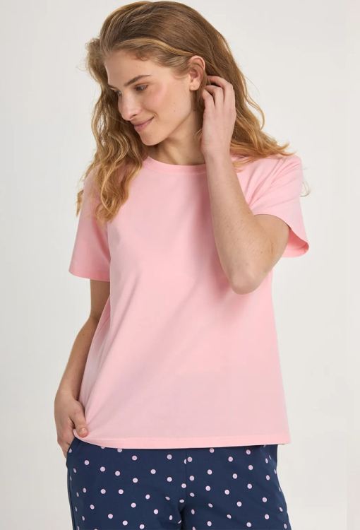 Красивая женская пижама из коллекции Rosy Raindrops от украинского бренда Ellen. Пижама выполнена из качественного и мягкого хлопка, состоит из футболки розового цвета и темно-синих штанов в розовый гороховый принт. Футболка прямого силуэта, с короткими рукавами и круглым вырезом горла, штаны также прямого кроя, с мягкой резинкой в поясе и удобными боковыми карманами. Пижама стильная и очень комфортная, также может быть отличной одеждой для дома или полезным подарком любимому и близкому человеку.