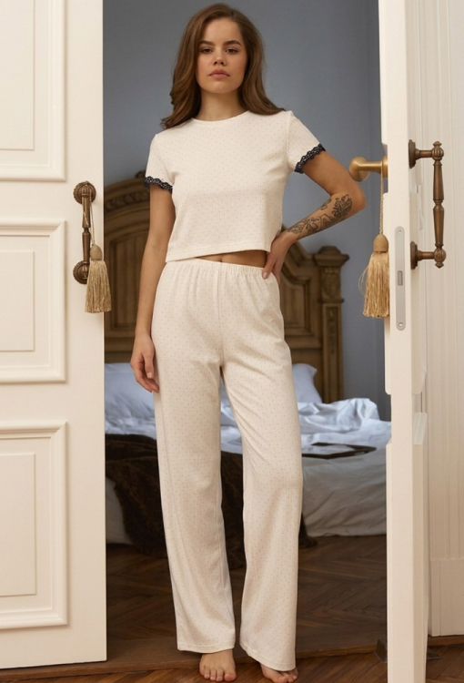 Красивая женская пижама из коллекции Flirty Dot от украинского бренда Your Touch. Пижама выполнена из мягкого и качественного хлопка в рубчик, кремового цвета с мелким принтом в виде черного гороха, состоит из футболки и штанов. Футболка прямого силуэта, с короткими рукавами и круглым вырезом горла, на рукавах украшена вставками из тонкого кружева черного цвета. Штаны свободного кроя и с мягкой резинкой в поясе, внизу оформлены разрезами. Пижама стильная и очень комфортная, также может быть удобной одеждой для дома, или замечательным подарком любимому и близкому человеку.