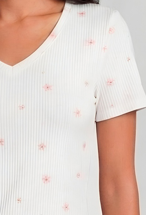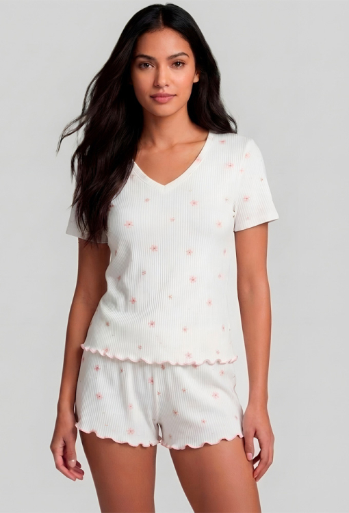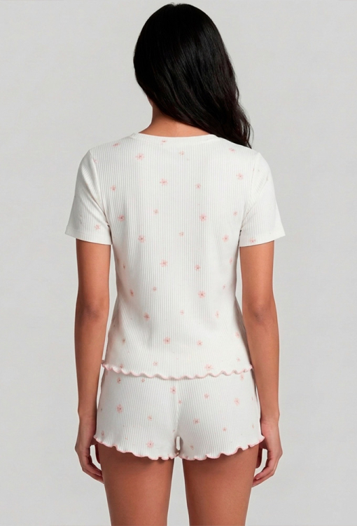 Летняя женская пижама из коллекции Kvitto от украинского бренда Roksana. Пижама выполнена из мягкого и качественного хлопка в рубчик, белого цвета в цветочный принт розового цвета, состоит из футболки и шорт прямого силуэта. Футболка с короткими рукавами и V-образным вырезом горла, внизу украшена розовым волнистым швом. Шорты с мягкой резинкой в поясе и удобной посадкой, низ обработан декоративным швом розового цвета. Пижама очень красивая и комфортная, идеальный вариант для сна и беззаботного отдыха дома, а также может быть замечательным подарком любимому и близкому человеку.