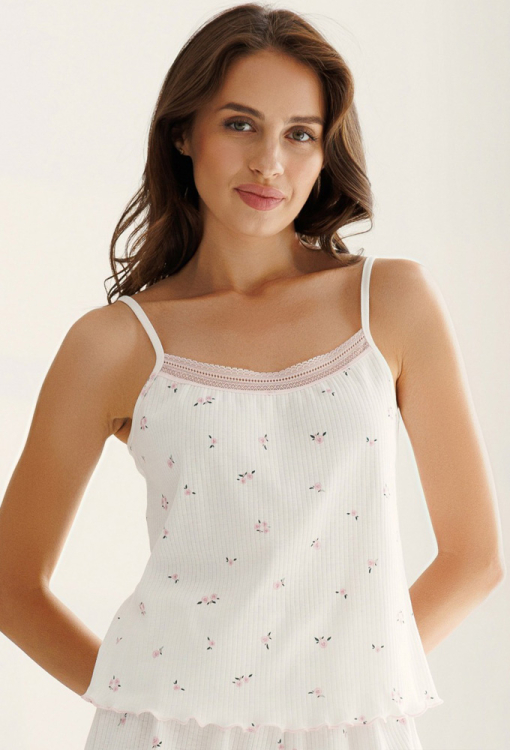 Легкая женская пижама из коллекции Розквитай от украинского бренда Roksana. Пижама выполнена из мягкого и качественного хлопка в рубчик, белого цвета с принтом в виде нежных розовых цветочков, состоит из майки свободного силуэта и коротких шорт. Майка на тонких регулируемых бретелях и с прямоугольным декольте, вверху украшена изящным кружевом, внизу - волнистым швом. Шорты также свободного кроя, с мягкой резинкой в поясе и волнистой отделкой внизу, создают удобную посадку и не стесняют движений. Пижама очень красивая и приятная к телу, идеальна для сна в любое время года, а также может быть полезным подарком любимому и близкому человеку.