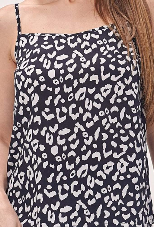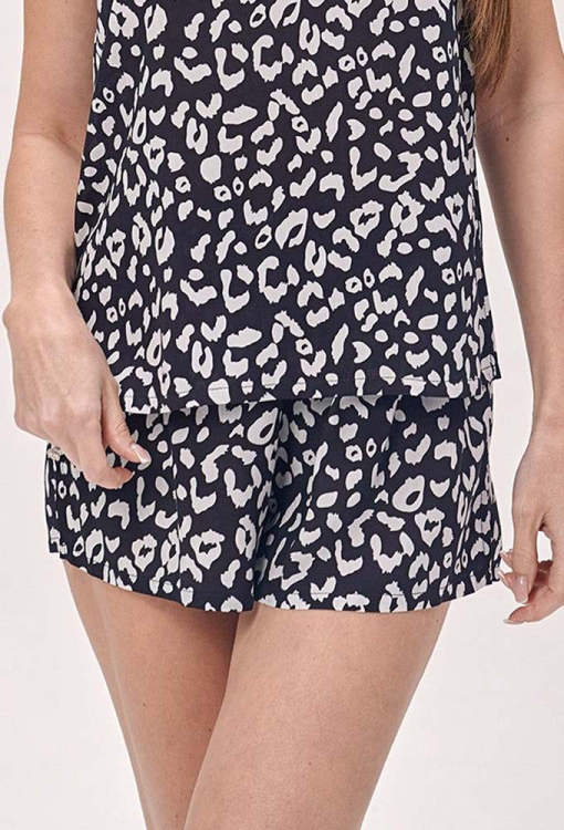 Легкая женская пижама от украинского бренда Shato. Пижама выполнена из качественного и мягкого хлопка с вискозой, черного цвета в белый анималистический принт, состоит из майки с шортами свободного силуэта. Майка с тонкими регулируемыми бретелями и прямоугольным декольте, по бокам внизу обработана небольшими разрезами. Шорты с мягкой резинкой в поясе и боковыми разрезами создают комфортную посадку, не стесняют движений. Пижама очень красивая и удобная, идеальна для сна и соблазнительного домашнего образа, также может быть отличным подарком любимому или близкому человеку.
