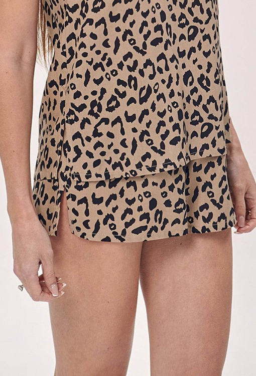 Легкая женская пижама от украинского бренда Shato. Пижама выполнена из качественного и мягкого хлопка с вискозой, бежевого цвета в черный анималистический принт, состоит из майки с шортами свободного силуэта. Майка с тонкими регулируемыми бретелями и прямоугольным декольте, по бокам внизу обработана небольшими разрезами. Шорты с мягкой резинкой в поясе и боковыми разрезами создают комфортную посадку, не стесняют движений. Пижама очень красивая и удобная, идеальна для сна и соблазнительного домашнего образа, также может быть отличным подарком любимому или близкому человеку.