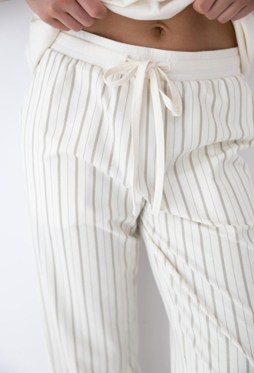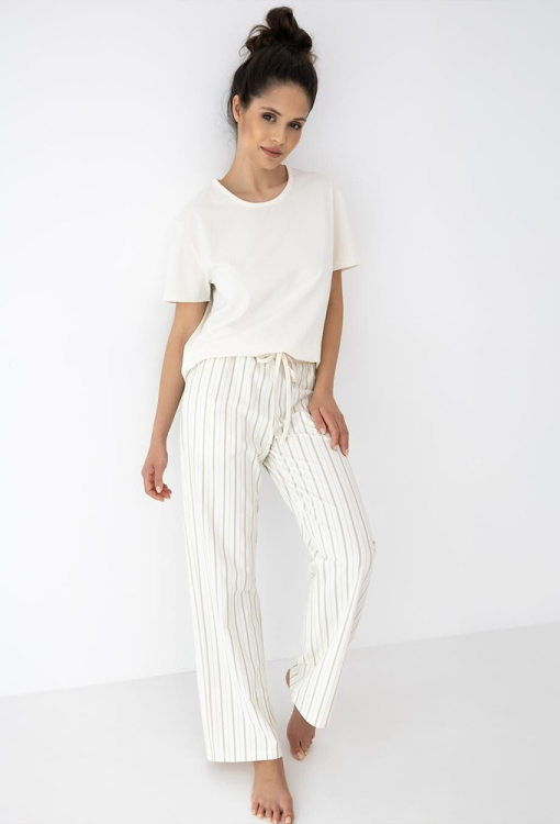Комфортная женская пижама Soleil от польского бренда Sensis. Пижама выполнена из качественного и мягкого хлопка кремового цвета, состоит из однотонной футболки и штанов с бежевым полосатым принтом. Футболка свободного силуэта, с короткими рукавами и круглым вырезом. Штаны также свободного кроя с эластичным однотонным поясом и удобными боковыми карманами, регулируются по ширине с помощью внутреннего шнурка. Пижама не только привлекательна и невероятно удобная - она легко становится любимым домашним комплектом и отличным подарком для любимого или близкого человека.