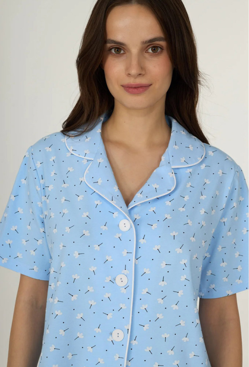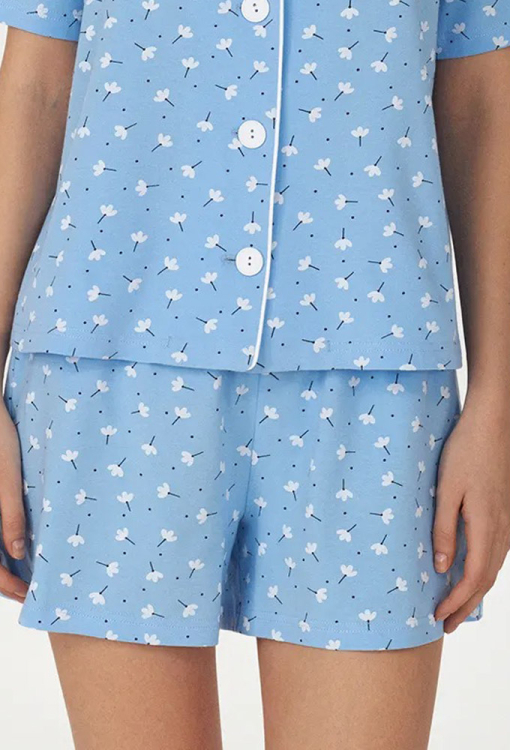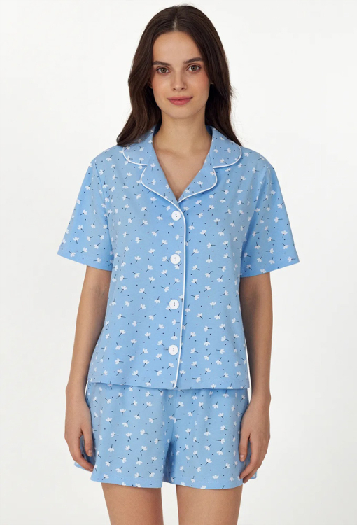 Классическая женская пижама из коллекции Summer Song от украинского бренда Ellen. Пижама выполнена из качественного и мягкого хлопка голубого цвета с мелким принтом из белых цветочков, состоит из рубашки и шорт прямого силуэта. Рубашка с короткими рукавами и отложным воротником, застегивается на пуговицы. Воротник и полки модели украшены тонким кантом белого цвета, шорты с мягкой резинкой в поясе. Пижама очень красивая и комфортная, может быть отличной одеждой для дома или полезным подарком любимому и близкому человеку.