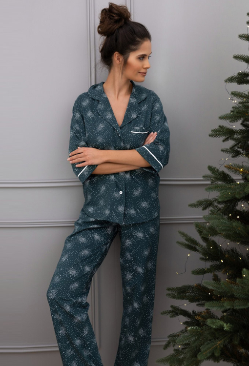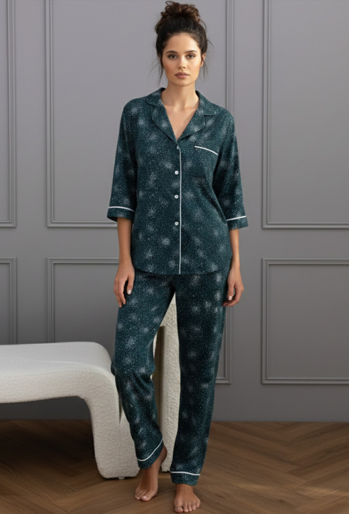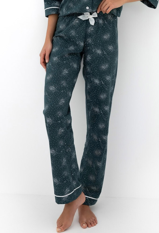 Стильная женская пижама Sydney от польского бренда Sensis. Пижама выполнена из качественного и мягкого хлопка, зеленого цвета с принтом в виде белых точек, состоит из рубашки со штанами прямого силуэта. Рубашка с рукавами 3/4, отложным воротником и застежкой на пуговицы - идеальный вариант для уютных домашних моментов. На груди рубашка обработана маленьким накладным карманчиком, украшенным кантом белого цвета, рукава также обработаны тонким контрастным кантом. Штаны с удобной посадкой и мягкой резинкой в поясе, украшены белым атласным бантиком на талии и тонким кантом внизу, что придает образу деликатной женственности. Пижама не только привлекательна и невероятно удобная - она легко становится любимым домашним комплектом и отличным подарком для любимого или близкого человека.