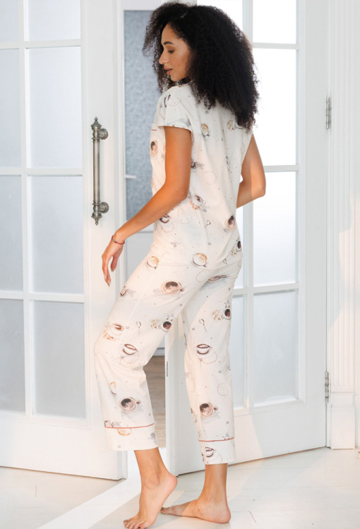 Стильная женская пижама из коллекции Teadora от украинского бренда Roksana. Пижама выполнена из мягкого и качественного хлопка, кремового цвета с интересным принтом из чашек с кофе и сладостей, состоит из рубашки и капри прямого силуэта. Рубашка с короткими рукавами и отложным воротником, застегивается на пуговицы. На груди слева модель украшена маленьким накладным карманчиком, воротник, полки и карман обработаны тонким кантом оранжевого цвета. Капри с мягкой резинкой в поясе, внизу украшены контрастным кантом. Пижама очень красивая и комфортная, создаст атмосферу уюта, а также может быть замечательным подарком любимому и близкому человеку.