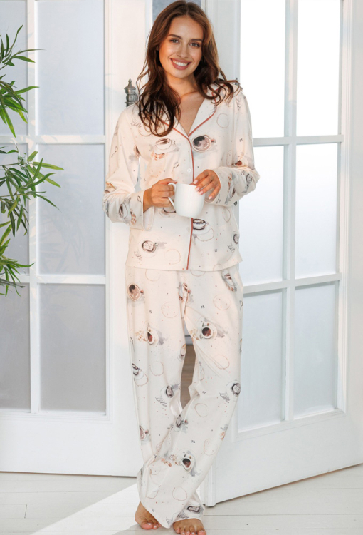 Классическая женская пижама из коллекции Teadora от украинского бренда Roksana. Пижама выполнена из мягкого и качественного хлопка, кремового цвета с интересным принтом из чашек с кофе и сладостей, состоит из рубашки прямого силуэта и штанов свободного кроя. Рубашка с длинными рукавами и отложным воротником, застегивается на пуговицы. Воротник и полки модели украшены тонким кантом оранжевого цвета, штаны с мягкой резинкой в поясе. Пижама очень красивая и комфортная, создаст атмосферу уюта, а также может быть замечательным подарком любимому и близкому человеку.