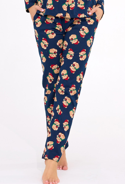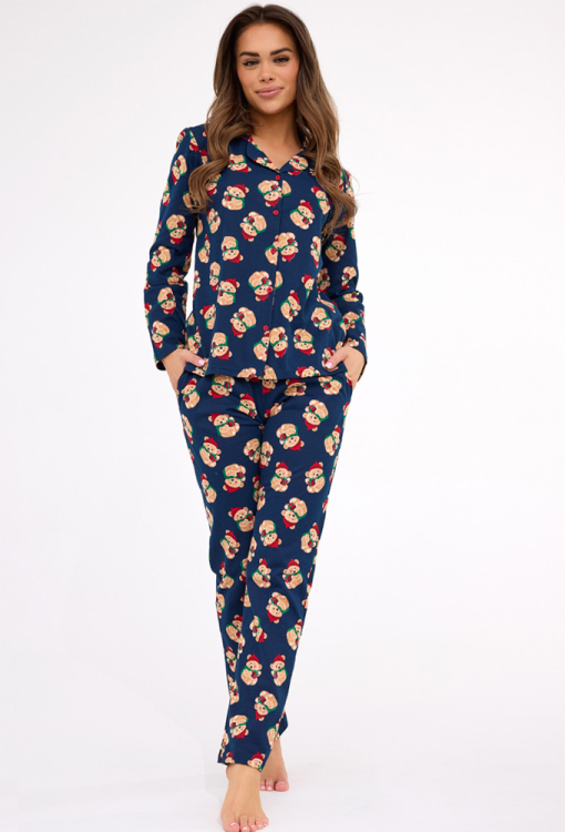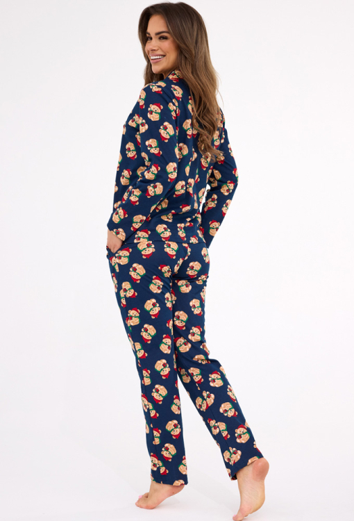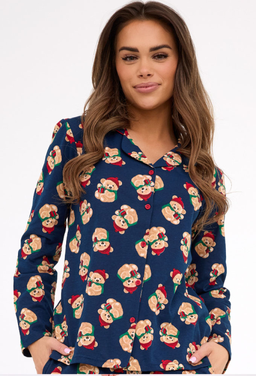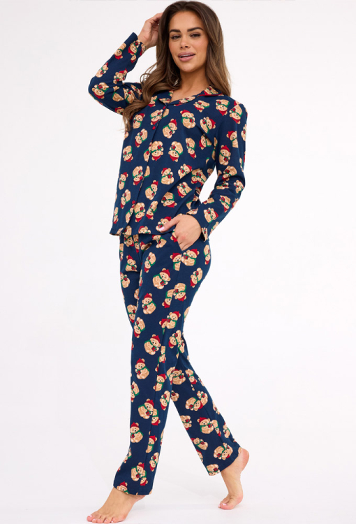 Очаровательная женская пижама Teddy от польского бренда Cornette. Пижама выполнена из качественного и мягкого хлопка, темно-синего цвета с принтом в виде мишек Тедди в красных колпаках и с Рождественскими подарками, состоит из рубашки со штанами прямого силуэта. Рубашка с длинными рукавами и отложным воротником, застегивается на пуговицы. Штаны с комфортной посадкой и мягкой резинкой в поясе, по бокам обработаны удобные карманы. Пижама очень красивая и стильная, идеальный выбор для зимних ночей и праздников дома, упакованная в фирменную коробку - отличный подарок любимому и близкому человеку.