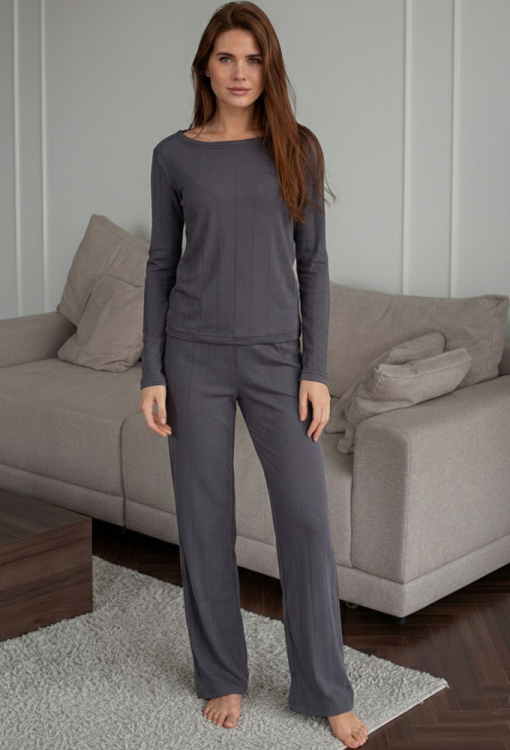 Стильная женская пижама от украинского бренда TimiRilla. Пижама выполнена из качественного и мягкого фактурного трикотажа графитового цвета, состоит из кофты и штанов прямого силуэта. Кофта с длинными рукавами и широким вырезом горла лодочка, штаны с удобной посадкой и мягкой резинкой в поясе. Пижама очень красивая и комфортная, идеальна для сна и домашнего отдыха, также может быть отличным подарком любимому или близкому человеку.