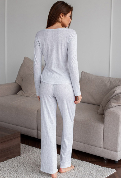 Стильная женская пижама от украинского бренда TimiRilla. Пижама выполнена из качественного и мягкого фактурного трикотажа серого меланжевого цвета, состоит из кофты и штанов прямого силуэта. Кофта с длинными рукавами и широким вырезом горла лодочка, штаны с удобной посадкой и мягкой резинкой в поясе. Пижама очень красивая и комфортная, идеальна для сна и домашнего отдыха, также может быть отличным подарком любимому или близкому человеку.