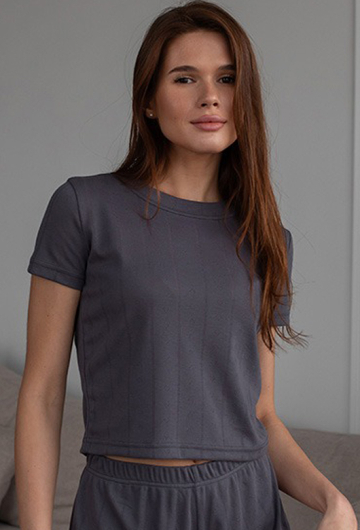 Нежная женская пижама от украинского бренда TimiRilla. Пижама выполнена из качественного и мягкого фактурного трикотажа графитового цвета, состоит из укороченной футболки прямого силуэта и коротких шорт. Футболка с короткими рукавами и круглым вырезом горла, шорты с удобной посадкой и мягкой резинкой в поясе. Пижама очень красивая и комфортная, идеальна для сна и домашнего отдыха, также может быть отличным подарком любимому или близкому человеку.