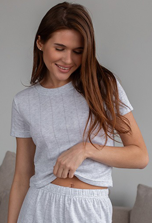 Нежная женская пижама от украинского бренда TimiRilla. Пижама выполнена из качественного и мягкого фактурного трикотажа серого меланжевого цвета, состоит из укороченной футболки прямого силуэта и коротких шорт. Футболка с короткими рукавами и круглым вырезом горла, шорты с удобной посадкой и мягкой резинкой в поясе. Пижама очень красивая и комфортная, идеальна для сна и домашнего отдыха, также может быть отличным подарком любимому или близкому человеку.