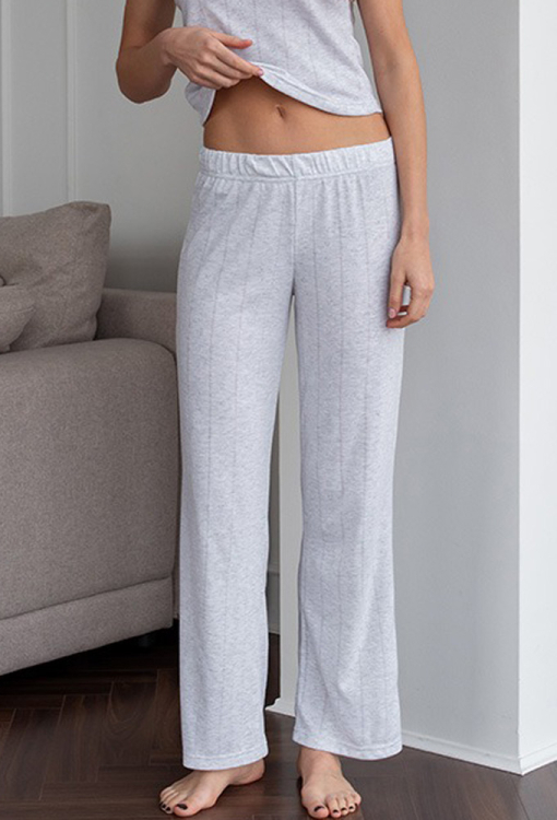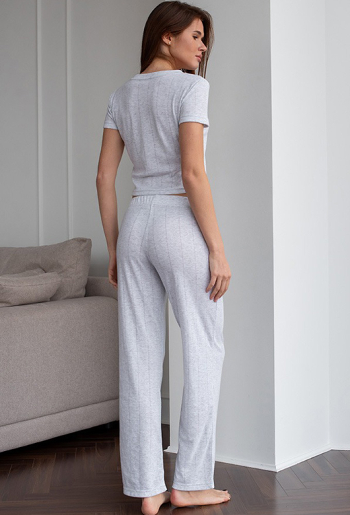 Нежная женская пижама от украинского бренда TimiRilla. Пижама выполнена из качественного и мягкого фактурного трикотажа серого меланжевого цвета, состоит из укороченной футболки со штанами прямого силуэта. Футболка с короткими рукавами и круглым вырезом горла, штаны с удобной посадкой и мягкой резинкой в поясе. Пижама очень красивая и комфортная, идеальна для сна и домашнего отдыха, также может быть отличным подарком любимому или близкому человеку.