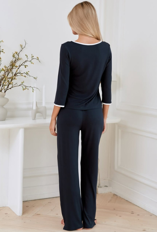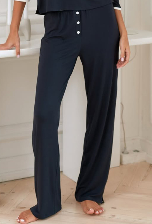 Стильная женская пижама из коллекции Trendy от украинского бренда Your Touch. Пижама выполнена из мягкой и качественной вискозы графитового цвета, состоит из кофты прямого силуэта и свободных штанов. Кофта с рукавами 3/4 и круглым вырезом горла, горловина модели обработана кантом белого цвета и украшена планкой с пуговицами, рукава внизу также оформлены белым кантом. Штаны с мягкой резинкой в поясе и небольшими боковыми разрезами внизу, украшены пуговицами и белым кантом по линии пояса. Пижама очень красивая и комфортная, также может быть удобной одеждой для дома, или замечательным подарком любимому и близкому человеку.