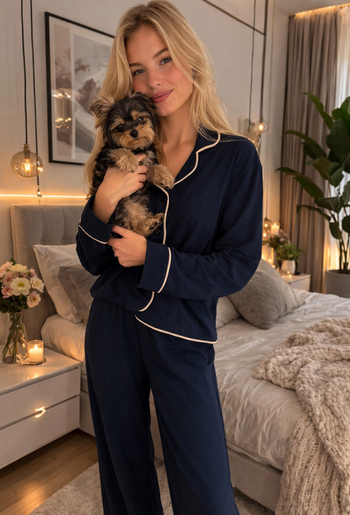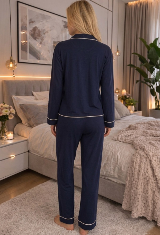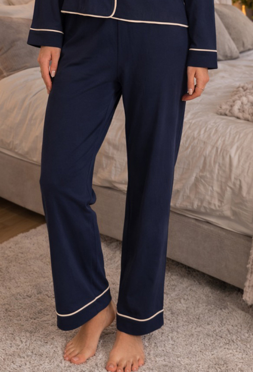 Классическая женская пижама Unity от украинского бренда Cosy. Пижама выполнена из качественного и мягкого хлопка темно-синего цвета, состоит из рубашки и штанов прямого силуэта. Рубашка с длинными рукавами и отложным воротником, застегивается на пуговицы. Воротник, полки, рукава и низ модели украшены тонким кантом кремового цвета. Штаны с мягкой резинкой в поясе и удобными боковыми карманами, внизу и на карманах обработаны контрастным кантом. Пижама очень красивая и приятная к телу, идеальна для сна и домашнего отдыха, а также может быть замечательным подарком любимому и близкому человеку.