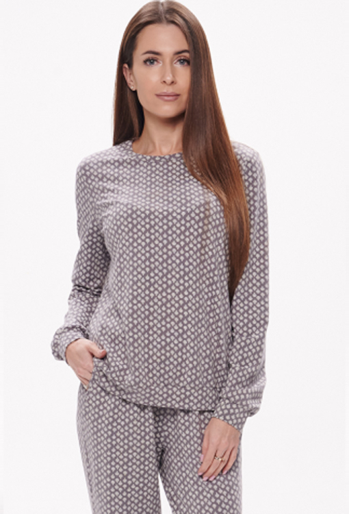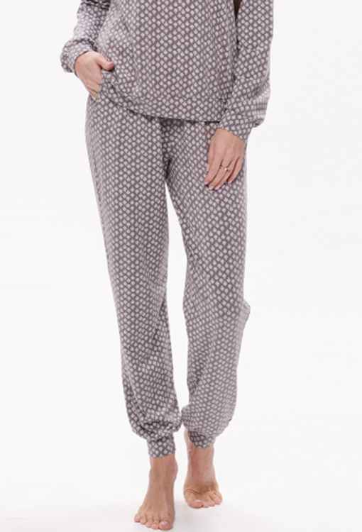 Нежная и комфортная женская пижама от украинского бренда Wiktoria. Пижама выполнена из качественного и мягкого хлопка, серого цвета в белый цветочный орнамент, состоит из кофты прямого силуэта и штанов на манжетах. Кофта с длинными рукавами и небольшим круглым вырезом горла, рукава и низ обработаны манжетами. Штаны с мягкой резинкой в поясе и удобными боковыми карманами. Пижама стильная и очень удобная, также может быть использована в качестве домашней одежды или подарка любимому и близкому человеку.
