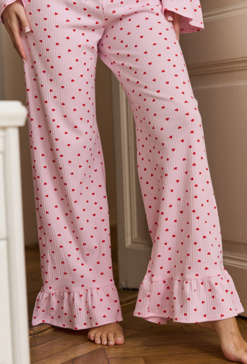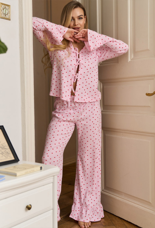 Стильная женская пижама Bantik от украинского бренда Mi-Mi. Пижама выполнена из качественного и мягкого хлопкового трикотажа в рубчик, розового цвета в принт из мелких красних сердечек, состоит из жакета прямого силуэта и свободных штанов. Жакет с длинными рукавами и V-образным вырезом горла, завязывается на завязки, рукава украшены очаровательными рюшами. Штаны с мягкой резинкой в поясе и широкими рюшами внизу. Пижама очень красивая и комфортная, идеальный вариант для домашних вечеров и утренних ритуалов, а также может быть замечательным подарком любимому и близкому человеку.