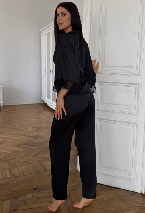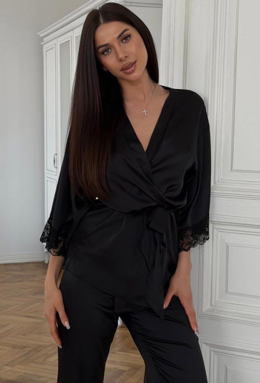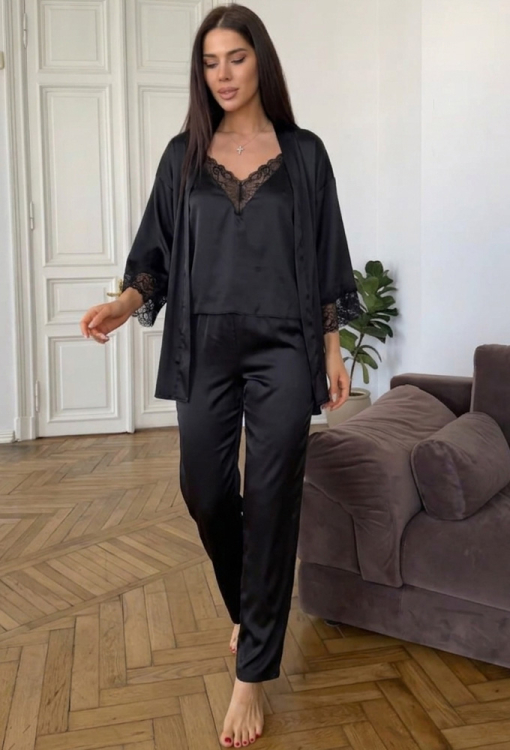 Универсальная женская пижама комплект от украинского бренда Julia Ulich. Комплект выполнен из мягкого и качественного шелк-сатина черного цвета, состоит из майки, штанов и халата. Майка прямого силуэта, с тонкими регулируемыми бретелями и V-образным декольте, по линии выреза украшена кружевом. Штаны прямого кроя и с мягкой резинкой в поясе. Халат длиной мини, свободного силуэта и с рукавами 3/4, завязывается на запах с помощью пояса, на рукавах украшен вставками из ажурного кружева. Комплект очень красивый и комфортный, идеальна для теплых летних ночей и домашнего отдыха, также может быть прекрасным подарком любимому и близкому человеку!