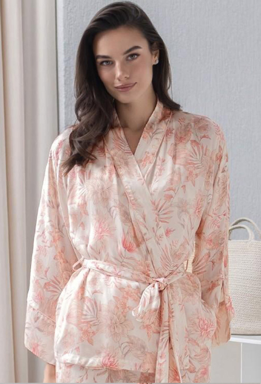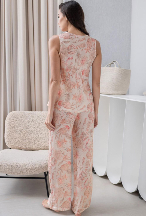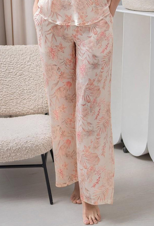 Стильная женская пижама комплект из коллекции Molly от итальянского бренда Mia-Amore. Комплект выполнен из качественного и мягкого вискозного шелка, с живописным растительным принтом жемчужно розового цвета, состоит из жакета, майки и штанов. Жакет свободного силуэта, с широкими длинными рукавами и воротником шаль, завязывается на запах с помощью пояса. Рукава модели обработаны свободными манжетами и украшены тонким кантом перламутрового цвета, воротник также оформлен кантом. Майка полуприлегающего силуэта, на широких бретелях и с V-образным декольте, украшенным вставками из ажурного кружева розового цвета и маленьким атласным бантиком с подвеской. Штаны с мягкой резинкой в поясе и удобными боковыми карманами. Комплект очень красивый и комфортный, подойдет как для сна, так и для домашнего отдыха или подарка близким людям!