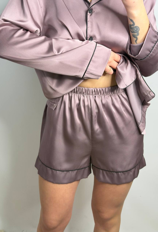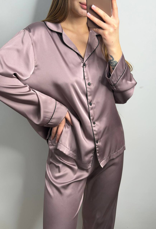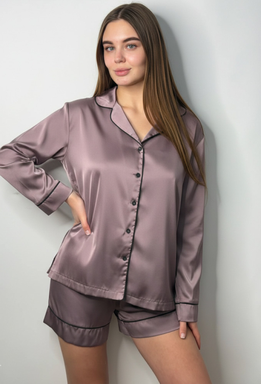 Комфортная женская пижама комплект от украинского бренда V.Velika. Комплект выполнен из качественного и мягкого шелка Армани цвета мокко, состоит из рубашки, штанов и шорт свободного силуэта. Рубашка с длинными рукавами, отложным воротником и небольшими разрезами внизу, застегивается на пуговицы. Воротник, полки и рукава модели украшены тонким кантом черного цвета. Штаны и шорты с удобной посадкой и мягкой резинкой в поясе, внизу оформлены контрастным кантом. Пижамный комплект невероятно красивый и удобный, идеальна как для сна, так и для уютного домашнего отдыха или подарка любиму и близкому человеку.