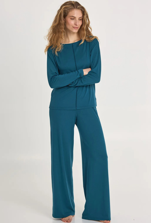 Комфортная женская пижама из коллекции Diadora от украинского бренда Ellen. Пижама выполнена из качественного и мягкого модала бирюзового цвета, состоит из кофты прямого кроя и штанов свободного силуэта. Кофта с длинными рукавами и круглым вырезом горла, спереди по центру обработана продольным декоративным швом. Штаны с удобной посадкой и мягкой резинкой в поясе. Пижама очень красивая и приятная к телу, станет любимой одеждой для сна и домашнего отдыха или замечательным подарком любимому или близкому человеку.