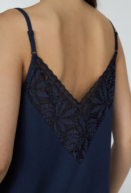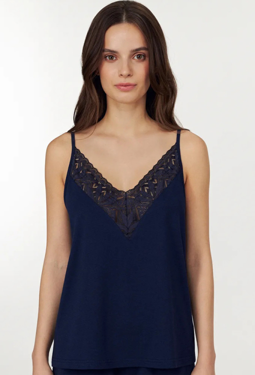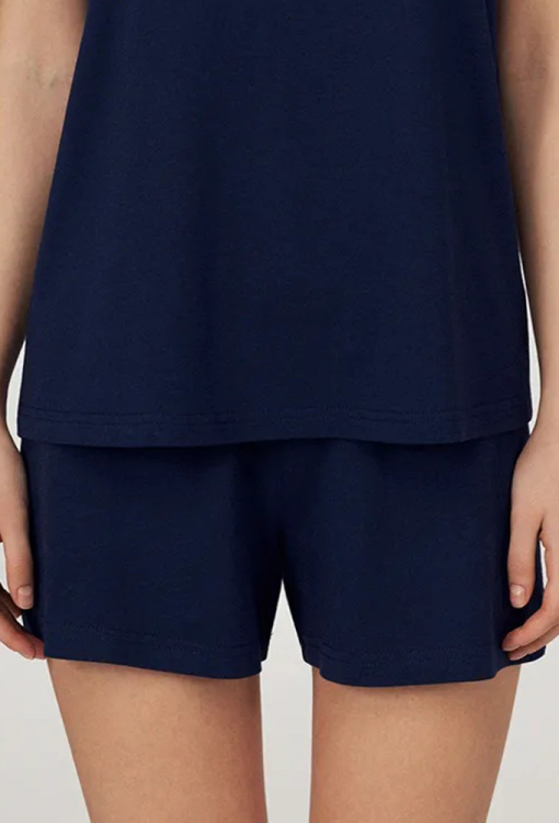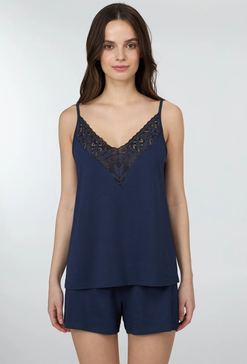 Элегантная женская пижама из коллекции Paola от украинского бренда Ellen. Пижама выполнена из качественного и мягкого модала синего цвета, состоит из майки и шортов свободного силуэта. Майка с тонкими регулируемыми бретелями, V-образным декольте и глубоким вырезом на спине, декольте и спинка модели украшены широкими вставками из ажурного кружева. Шорты с удобной посадкой и мягкой резинкой в поясе. Пижама очень красивая и комфортная, создана для спокойного сна и приятных утренних сборов, также может быть замечательным подарком любимому или близкому человеку.