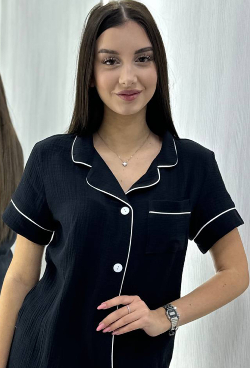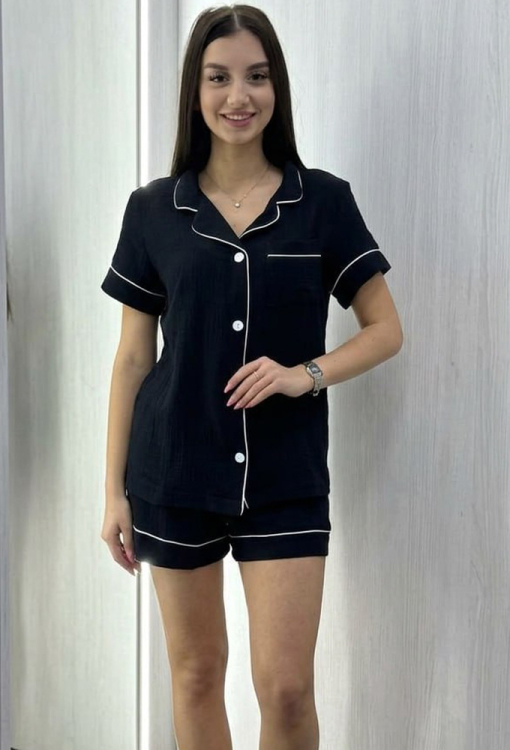 Классическая женская пижама от украинского бренда BO.Brand. Пижама выполнена из качественного и мягкого двухслойного муслина черного цвета, состоит из рубашки и шорт прямого силуэта. Рубашка с короткими рукавами и отложным воротником, застегивается на пуговицы, на груди слева украшена маленьким карманчиком. Воротник, полки рукава и карман изделия украшены тонким кантом белого цвета. Шорты с удобной посадкой и мягкой резинкой в поясе, внизу обработаны контрастным кантом. Пижама красивая и очень комфортная, идеальна для сна и домашнего отдыха, а также может быть замечательным подарком любимому и близкому человеку.