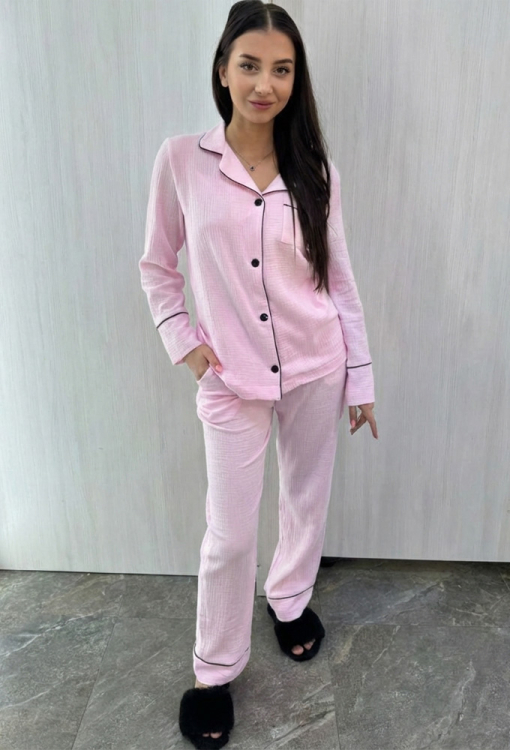 Нежная женская пижама от украинского бренда BO.Brand. Пижама выполнена из качественного и мягкого муслина розового цвета, состоит из рубашки и штанов прямого силуэта. Рубашка с длинными рукавами на свободных манжетах и отложным воротником, застегивается на пуговицы, на груди слева украшена маленьким карманчиком. Воротник, полки, рукава и карман украшены тонким кантом черного цвета. Штаны с удобной посадкой, мягкой резинкой в поясе и удобными боковыми карманами, внизу манжеты оформленные черным кантом. Пижама красивая и очень комфортная, идеальна для сна и домашнего отдыха, а также может быть замечательным подарком любимому и близкому человеку.
