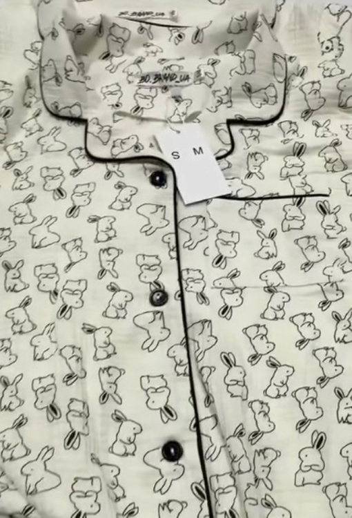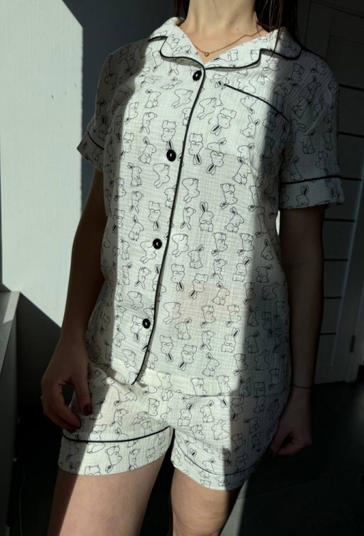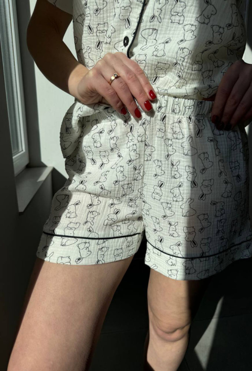 Летняя женская пижама от украинского бренда BO.Brand. Пижама выполнена из качественного и мягкого двухслойного муслина, белого цвета в принт из маленьких кроликов, состоит из рубашки и шорт прямого силуэта. Рубашка с короткими рукавами и отложным воротником, застегивается на пуговицы, на груди слева украшена маленьким карманчиком. Воротник, полки, рукава и карман украшены тонким кантом черного цвета. Шорты с удобной посадкой и мягкой резинкой в поясе, украшены контрастным кантом внизу. Пижама красивая и очень комфортная, идеальна для сна и домашнего отдыха, а также может быть замечательным подарком любимому и близкому человеку.